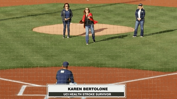 During a recent victory over Cal State Fullerton, stroke survivor Karen Bartolone threw out the first pitch. UCI Health neurologist Dr. Jay Shah also joined the ESPN broadcast to share insights about stroke care.
